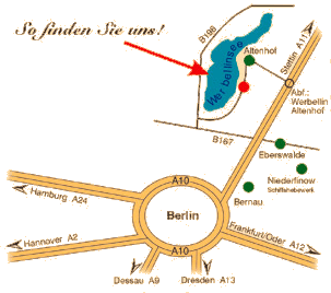 Autobahnabfahrt Werbellin, dann L238 nach links, nach 2 km Ortseingang Altenhof, dann links abbiegen in Eichhorster Weg, nach ca. 600 m haben Sie uns erreicht (neben Waldkaffee)